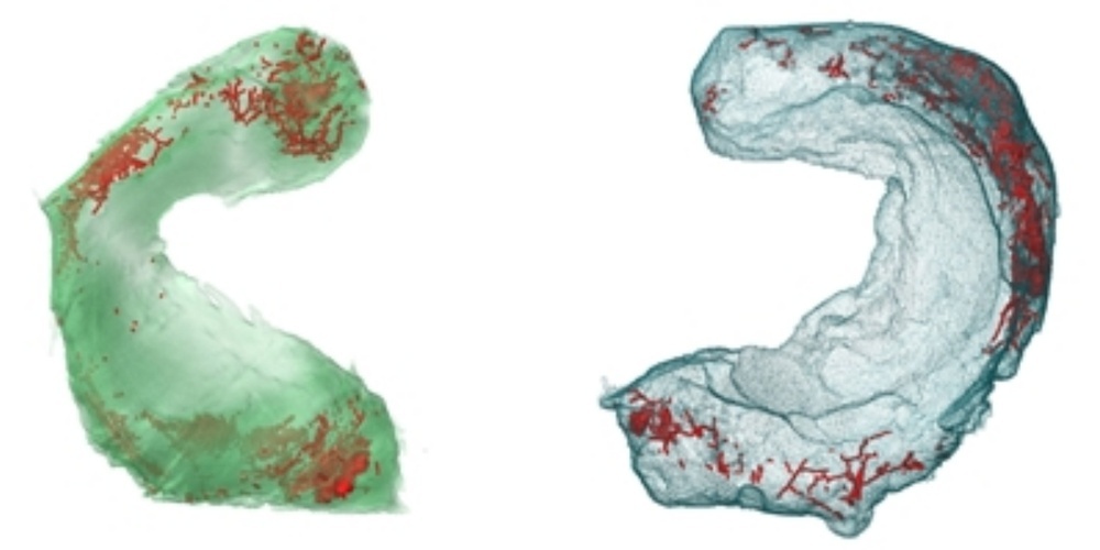 Soll zur Behandlung ein operativer Eingriff am Knie erfolgen, ist der Meniskus grundsätzlich kein dankbarer Kandidat, denn sein Gewebe wird nur in bestimmten Abschnitten mit Blut versorgt. Für gute Heilungschancen ist eine genaue Kenntnis dieses wertvollen Gefässgeflechts hilfreich. Bislang basieren die Informationen allerdings auf zweidimensionalen Bildern von Gewebeschnitten. Hierdurch gehen wertvolle Daten etwa zur Verformbarkeit des Knorpels oder zur Vernetzung der Gefässe verloren.