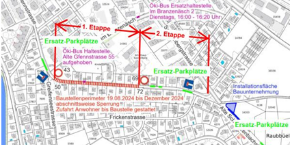 Die Alte Gfennstrasse wird für den Durchgangsverkehr während der gesamten Bauzeit etappenweise gesperrt. Die Zu- und Wegfahrten sind nur für die Anwohner zu ihren Grundstücken und mit Behinderungen möglich. In Ausnahmefällen (z. B. Einbau Abschlüsse, Belagseinbau) müssen die Fahrzeuge aus Qualitätsgründen ausserhalb der Baustelle auf den Ersatzparkplätzen entlang der Alten Gfennstrasse oder der Alten Schwerzenbachstrasse abgestellt werden, so die Stadt Dübendorf.