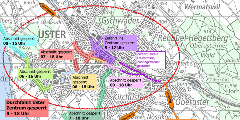 Aufgrund des Anlasses ist das Stadtzentrum zwischen 9 und 17 Uhr gänzlich gesperrt. Transitfahrten durch Uster, Umzüge und Lieferungen sind während dieser Zeit nicht möglich. Die Notfallachsen auf Stadtgebiet müssen für Rettungskräfte wie Sanität und Feuerwehr frei bleiben. Deswegen empfiehlt die Stadtpolizei, Uster grossräumig zu umfahren. Die Umleitungen sind signalisiert.