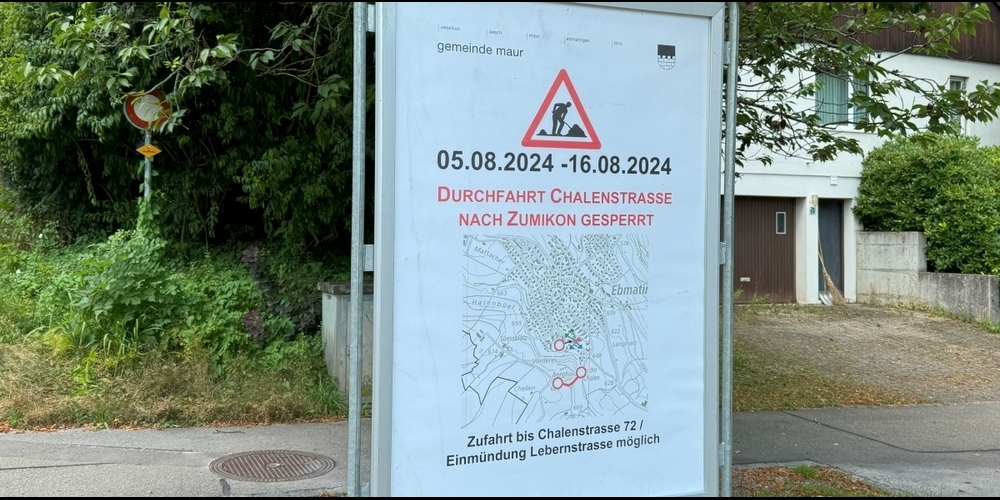 Wegen Sanierungsarbeiten bleibt die Chalenstrasse zwischen Hausnummer 72 und dem Parkplatz Süessblätz zwischen dem 5. und 16. August 2024 gesperrt. Für Anwohnende gibt die Gemeinde Entwarnung: «Die Zufahrten zu den Liegenschaften sind während der gesamten Bauzeit gewährleistet. Fahrende von/nach Ebmatingen bzw. Zumikon werden über die Wassbergstrasse – Aeschstrasse umgeleitet».