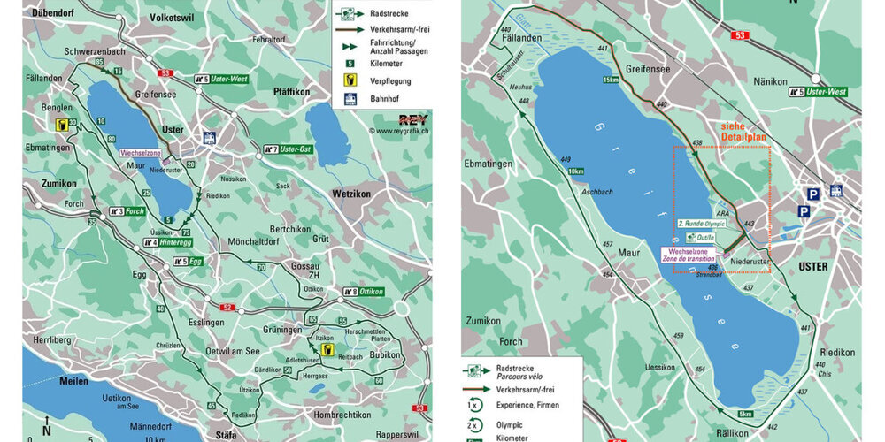 Radstrecke 90 km Mitteldistanz (links) und die Radstrecke Olympic, Experience, Firmen (rechts). Beide führen durch die Gemeinde Maur.