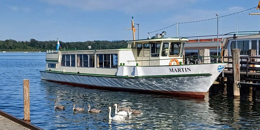 Etwas entfernt vom Passagierhafen liegt auf dem Firmengelände der Chiemsee-Schifffahrt eine nur noch von Fotos bekannte, aber doch alte Freundin vom Greifensee vor Anker: das von «Oberland» auf «Martin» umgetaufte Motorschiff, welches seit nunmehr 18 Jahren seinen Dienst als Charterschiff auf dem Chiemsee leistet.